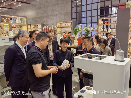 在斯玛特陶瓷展位,郭副部长等领导详细了解了陶瓷3D打印技术的原理和应用。通过3D建模后切片,导入机器即可按照系统程序自动实施打印。可以实现复杂形状的陶瓷产品制造,并且具有高效、低成本、可定制化等优点。