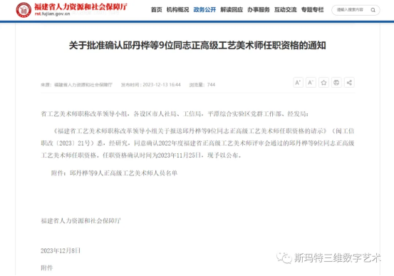 近日,根据《关于批准确认邱丹桦等9位同志正高级工艺美术师任职资格的通知》(闽人社批复〔2023〕764号)公布的内容,斯玛特企业创始人杨德安获评正高级工艺美术师任职资格。